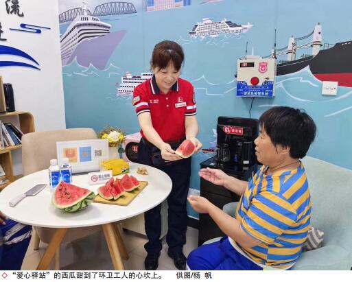 聚焦环卫工人,“爱心驿站”打造专属避暑空间。作为全国最美“爱心驿站”的沪东加能站内,站房一层的小屋成了环卫工人的“避暑港湾”。每日午后,工作人员会将西瓜准备好,搭配凉白开,供环卫工人取用。“能在阴凉处吃口甜西瓜,比啥都舒坦。”一位环卫工人接过西瓜时笑着说。