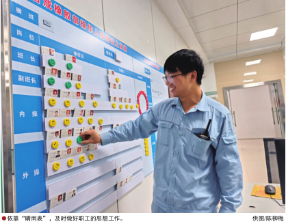 “上班看脸色,吃饭看胃口,干活看劲头,聊天看情绪。”一位网格长分享着他的“望闻问切”工作法。茂名石化始终坚持“抓生产从思想入手、抓思想从生产出发”,运用“三同时”(与员工同学习、同吃饭、同劳动)、“三知四访五必谈”、心情晴雨表、EAP等方法和手段,及时深入了解员工的思想动态,将员工的不良情绪化解在萌芽状态。