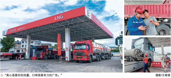 “师傅,跑长途累了吧?进站洗个澡、吹吹空调、歇歇脚吧。衣服放心丢进洗衣机,我们帮您洗!”凌晨时分,坐落在湖北省宜都市十里铺村的中国石化湖北宜昌石油分公司(以下简称:宜昌石油)宜都十里铺LNG站内依然灯火通明。员工小吴一句亲切的问候,让刚下高速的货车司机王师傅心头一热。这样温暖的画面,如今已经成为十里铺LNG站每一天的日常。