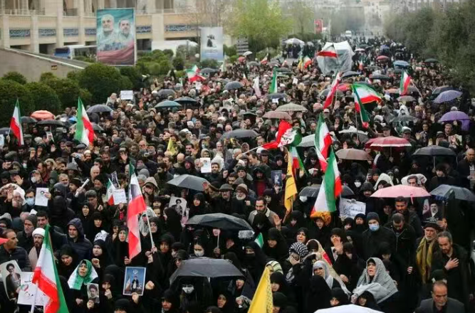 3月20日,在伊朗首都德黑兰,人们参加伊朗情报部长伊斯梅尔·哈提卜及其家人的遗体告别仪式。 来源新华社
