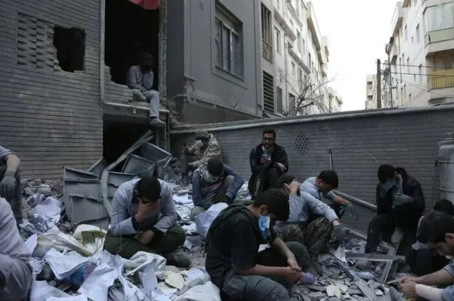 3月15日,在伊朗首都德黑兰的一处遇袭居民区,人们坐在一处建筑废墟上。新华社记者 沙达提 摄