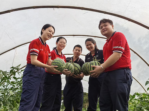 傍晚返程时,何大姐硬塞给志愿者们几个大西瓜:“带回去份小伙伴们尝尝,这可是咱们一起种的‘同心瓜’!”夕阳西下,返程的服务队抱着西瓜,更是抱着农户对中国石化的感激与信任。红工装志愿者们虽感疲劳,但脸上却洋溢着充满成就感的笑容,他们知道,这一抹石化红,不仅温暖了农户的心田,更在服务地方经济社会发展的画卷上留下了鲜亮的色彩。