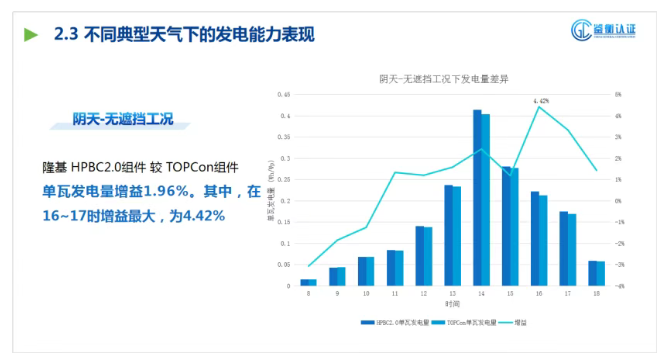 特别值得强调的是,在阴天无遮挡工况下,隆基HPBC 2.0的组件较TOPCon单瓦增益达到了1.96%,其中在16~17时增益最大,达到了4.42%。