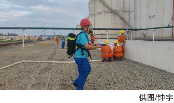 演练模拟301罐92号油品发生雷击起火,正在岗位上的工作人员发现火情后,立即向值班主任汇报,并启动应急预案开展自救,同时请求救援。