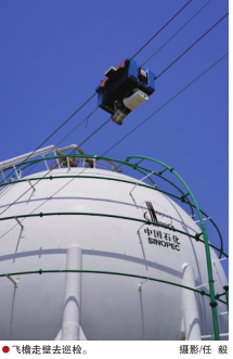 走进厂区的球罐区域,高高架设的缆索上,一台小巧的飞索智能巡检机器人正在进行空中巡检。这套今年3月上线的智能巡检机器人为罐区织起了一张“全天候、无死角”的安全监控网。